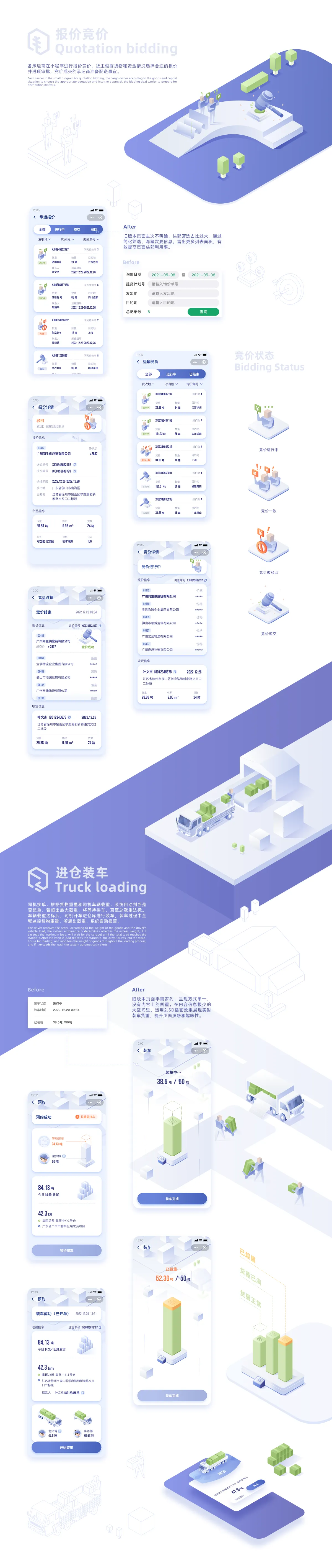 CTS貨物運輸小程序是一款針對物流公司量身打造的快捷管理工具,主要功能是物流服務(wù)預(yù)約、運輸競價、數(shù)據(jù)預(yù)覽、運輸實時信息查詢、實現(xiàn)物流配送的全程跟蹤等管理功能。本次設(shè)計基于現(xiàn)有的功能模塊,從布局、色彩、插畫、圖標(biāo)和字體等方面進行全方位的視覺升級,尤其是可視化的升級需求進行了大量的改進優(yōu)化。本次優(yōu)化升級在提升用戶體驗的同時,對頁面設(shè)計進行全新的2.5D視覺風(fēng)格嘗試,目的是發(fā)掘更多小程序設(shè)計可能性和視覺體驗。