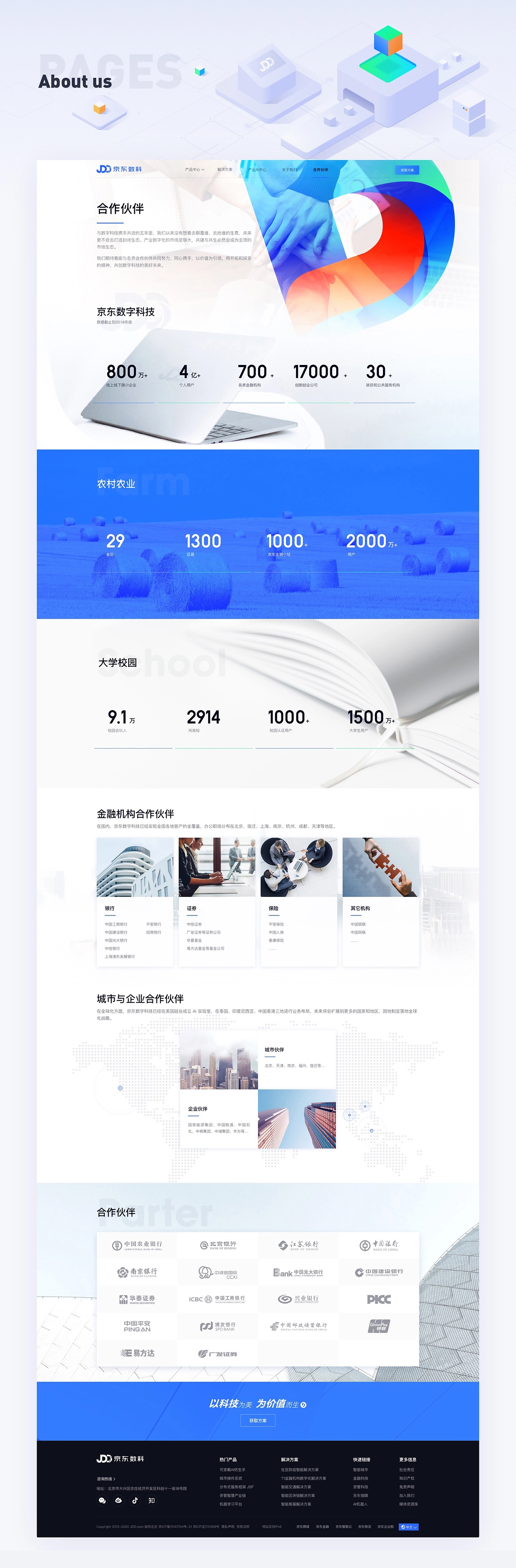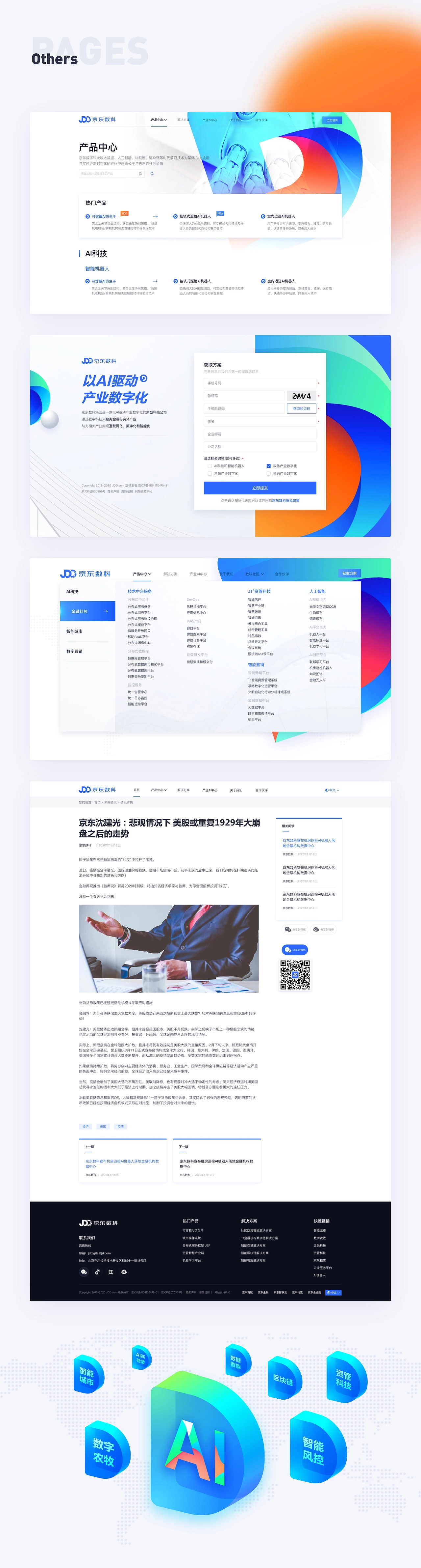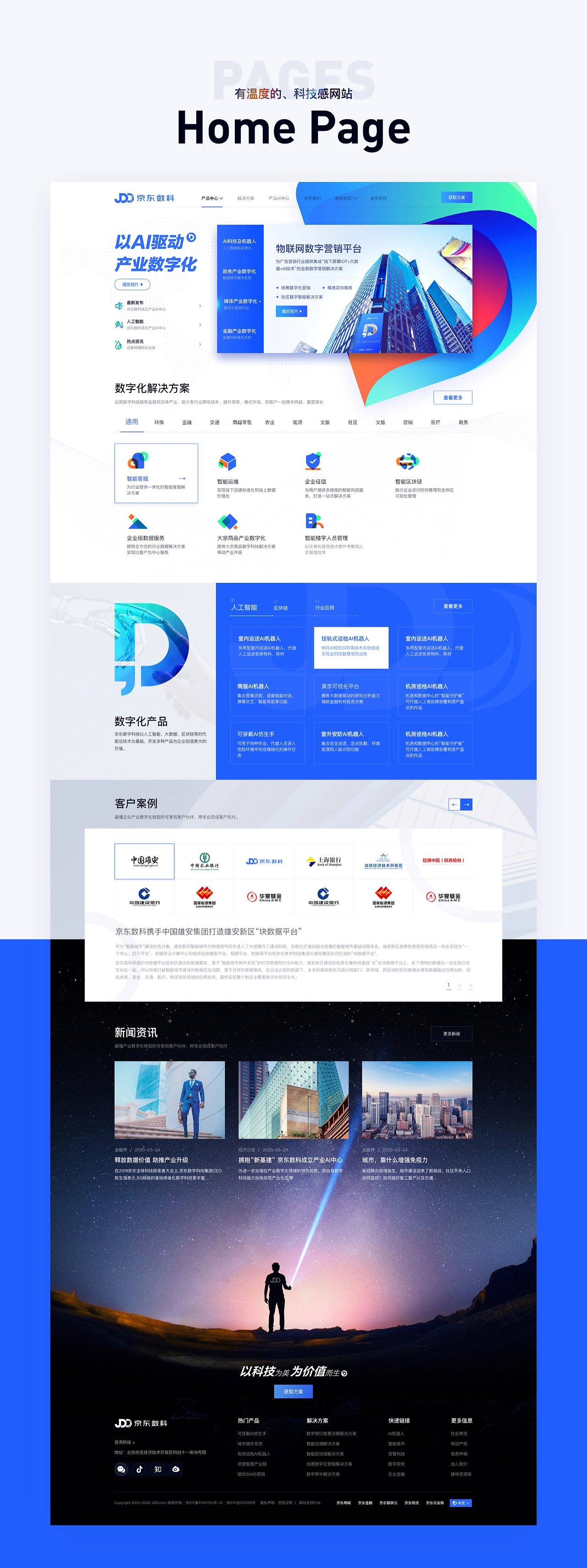 京東數(shù)字科技集團(tuán)是一家以AI驅(qū)動產(chǎn)業(yè)數(shù)字化的新型科技公司,感恩選擇,感謝信賴,有機(jī)會能夠參與設(shè)計項目, 定位 設(shè)計一款“有溫度的、科技感官網(wǎng)”?;谶@個理念,在腦海中摒棄了傳統(tǒng)的深色科技感網(wǎng)站的風(fēng)格,決定使用白色作為背景色,在以logo藍(lán)為基調(diào)的情況下,豐富頁面的色彩,使得網(wǎng)頁整體給人一種時尚、輕快、明亮而又絢麗的感覺。 感謝京東市場推廣部合作伙伴的支持和幫助!