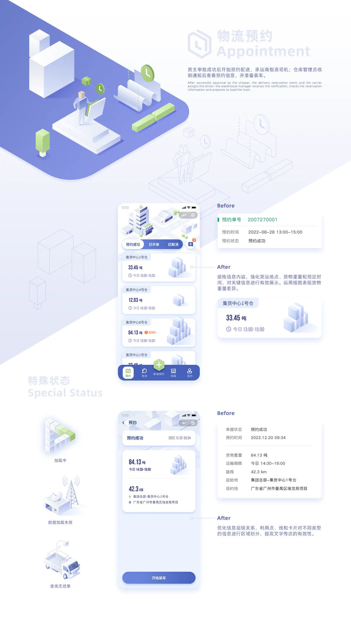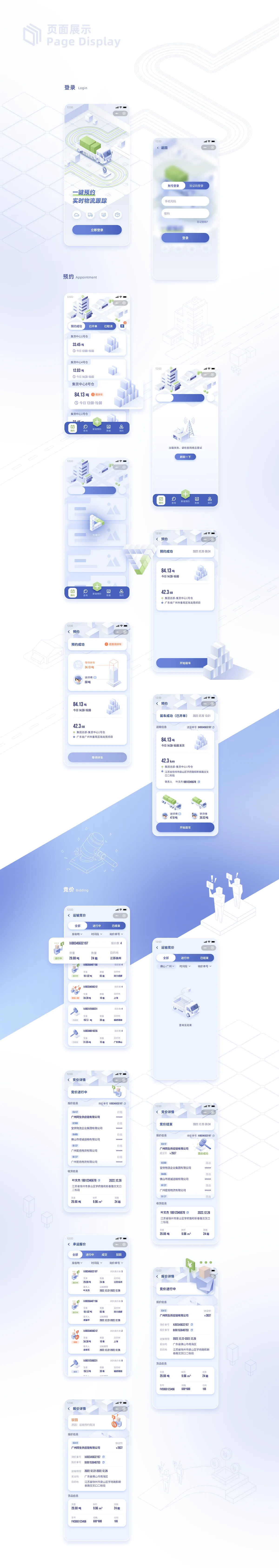 CTS貨物運輸小程序是一款針對物流公司量身打造的快捷管理工具,主要功能是物流服務(wù)預(yù)約、運輸競價、數(shù)據(jù)預(yù)覽、運輸實時信息查詢、實現(xiàn)物流配送的全程跟蹤等管理功能。本次設(shè)計基于現(xiàn)有的功能模塊,從布局、色彩、插畫、圖標(biāo)和字體等方面進行全方位的視覺升級,尤其是可視化的升級需求進行了大量的改進優(yōu)化。本次優(yōu)化升級在提升用戶體驗的同時,對頁面設(shè)計進行全新的2.5D視覺風(fēng)格嘗試,目的是發(fā)掘更多小程序設(shè)計可能性和視覺體驗。