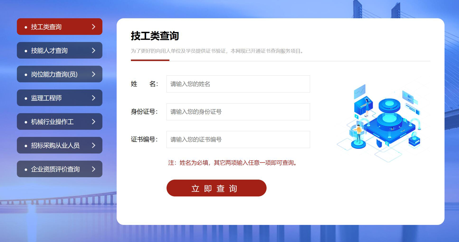 職業(yè)技能數(shù)據(jù)查詢系統(tǒng)是一款高效便捷的數(shù)字化工具。它整合了各類證書相關(guān)信息,無論是學(xué)歷、職業(yè)資格證書還是技能證書等都能涵蓋其中。通過該系統(tǒng),用戶只需在搜索框輸入證書編號、個人身份信息等關(guān)鍵數(shù)據(jù),就能快速精準(zhǔn)地獲取證書的詳細內(nèi)容,包括證S頒發(fā)機構(gòu)、頒發(fā)日期、有效期等。這一系統(tǒng)不僅方便了個人隨時查證自己證S的真實性與有效性,也為企業(yè)在人才招聘時核實求職者證書信息提供了可靠途徑,極大地提升了數(shù)據(jù)管理與驗證的效率 。