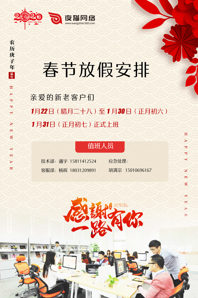 春節(jié)臨近,君和數(shù)智全體員工給您拜年了,提前祝您新春快樂(lè),生意興?。?br /> 根據(jù)全國(guó)春節(jié)假期的相關(guān)規(guī)定,我公司將于2020年1月22日至1月30日(共9天)安排放假,1月31日(正月初七)正式上班。