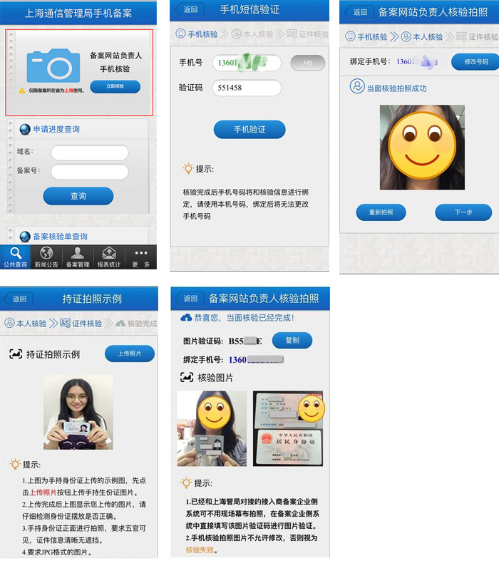 (3)第三步證件核驗(yàn):先上傳手持身份證的照片(要求五官可見,證件清晰無遮擋),然后按照提示依次拍攝身份證正反面,軟件中會(huì)展示拍攝后的圖片并添加“僅限備案使用”文字,核驗(yàn)完成會(huì)顯示圖片驗(yàn)證碼,請(qǐng)將此驗(yàn)證碼填寫到備案系統(tǒng)中。